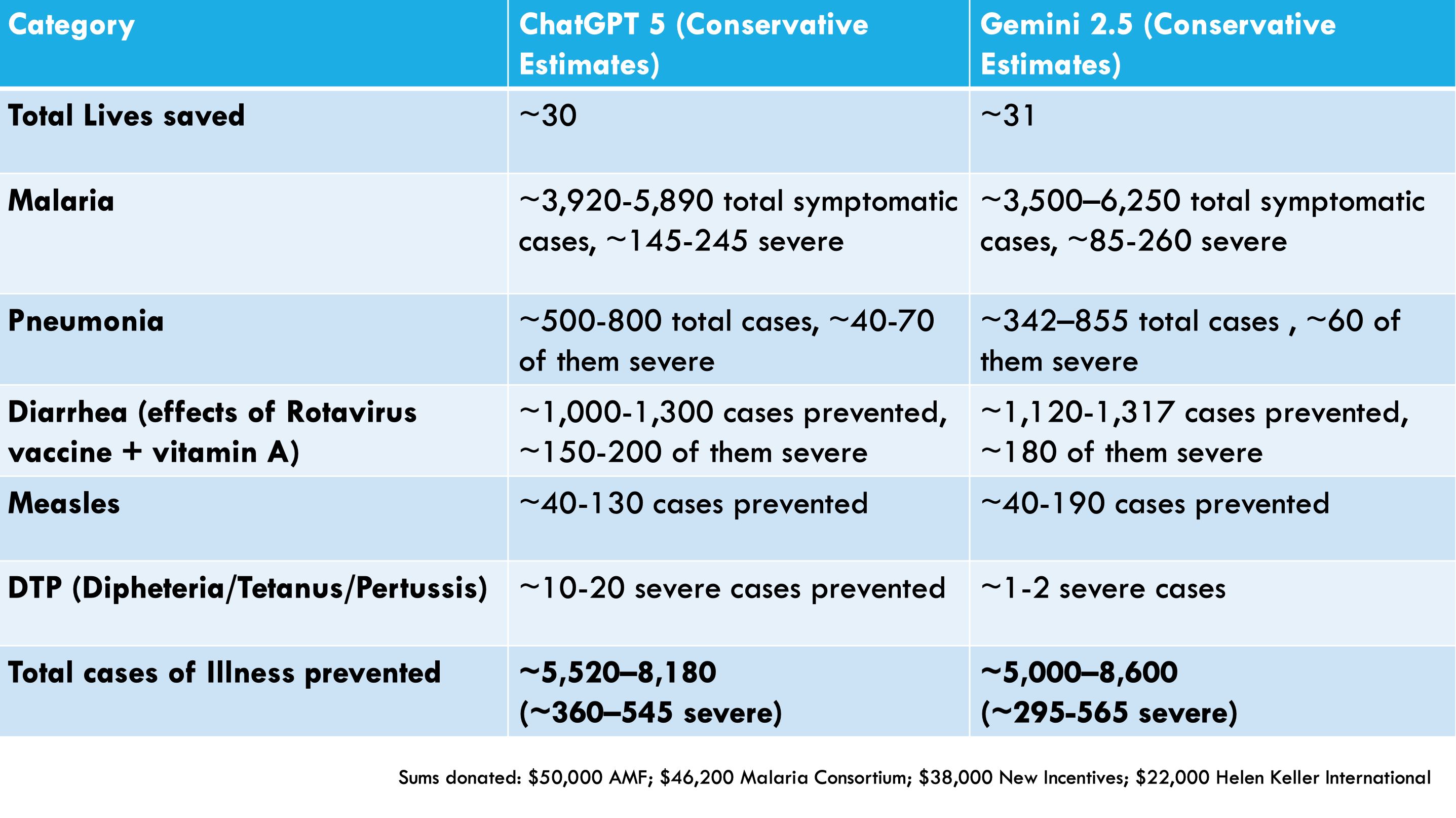 In an attempt to put the initiative’s impact on actual human lives into perspective (for myself and others), I recently asked both ChatGPT5 and Gemini 2.5 to separately break down the expected impact of the money our project has raised in terms of what kind of illnesses were prevented and approximately how many cases of each.